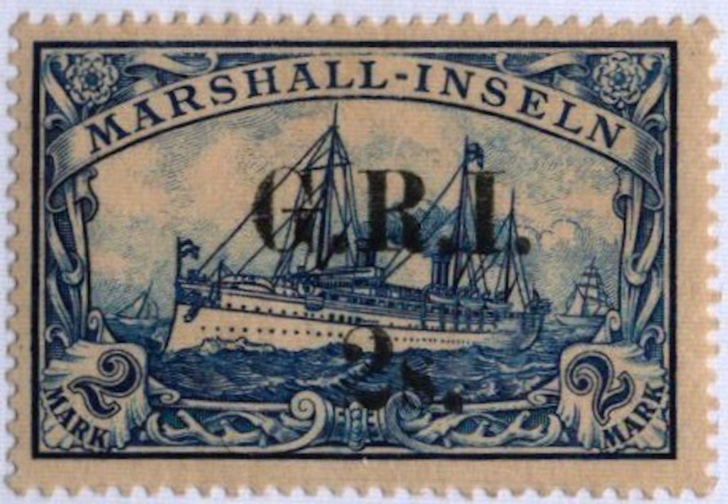 When the Australian Naval and Military Expeditionary Force occupied German New Guinea in 1914, it overprinted existing stocks of the German New Guinea Marshall Islands stamps with the initials "G.R.I." (Georgius Rex Imperator), referring to King George V. They were only used for a short period of time and are, therefore, very rare and most surviving examples have condition flaws.