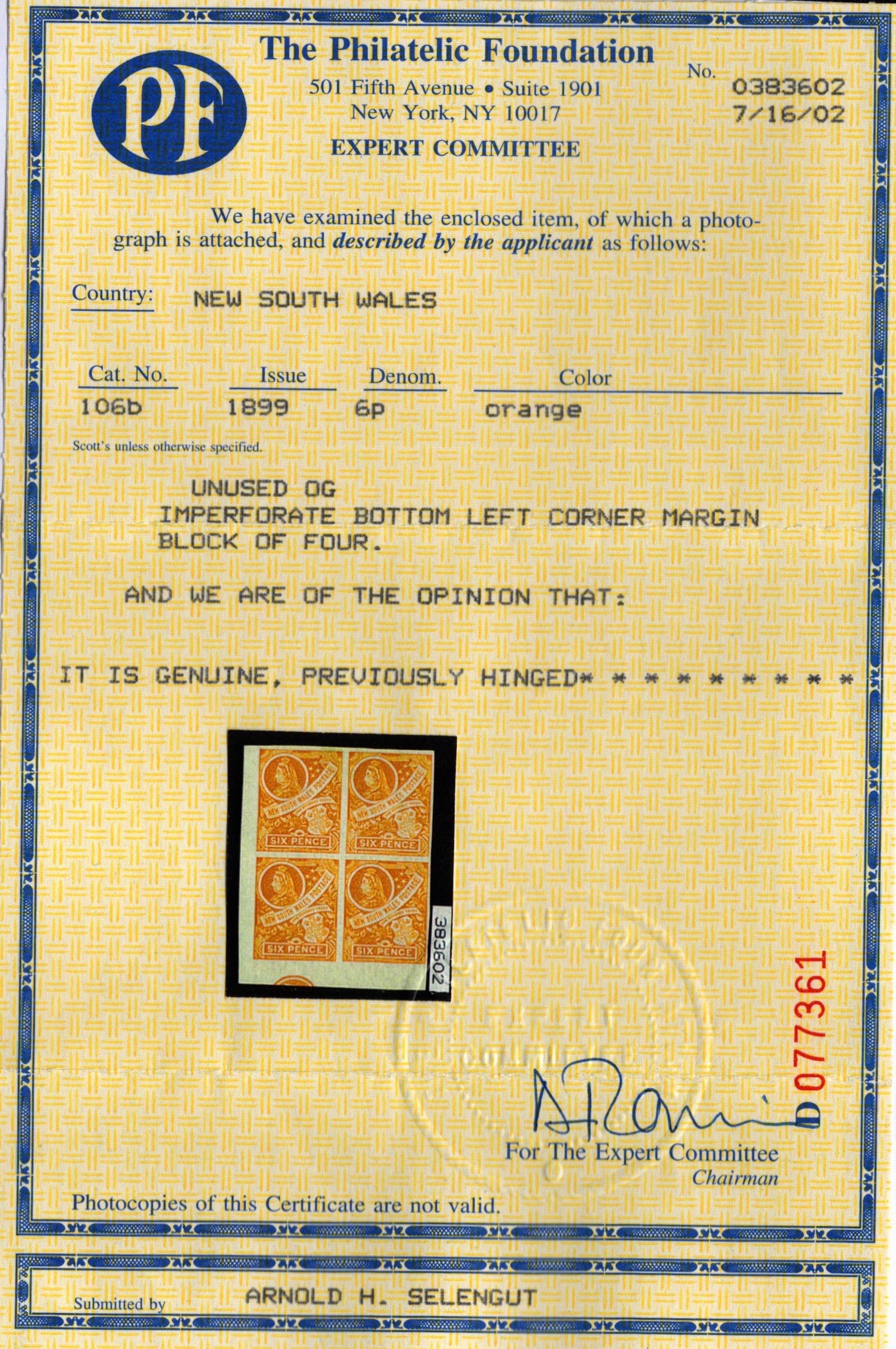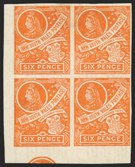 Australia New South Wales 1899 6d deep orange, chalk-surfaced paper, watermark 40, SG305a, IMPERFORATE lower left corner block of 4 with partial plate number.