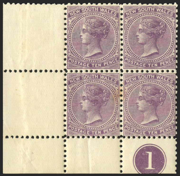 Australia New South Wales 1907 10d violet, watermark w11, lower left corner block of 4 with plate number '1', SG361.