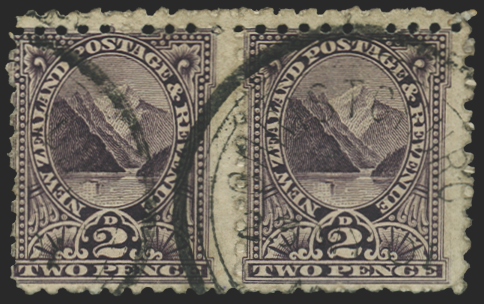 New Zealand 1900 2d dull violet, "Pirie" paper, perforations 11, horizontal pair showing variety double horizontal perforations at top, SG276var.