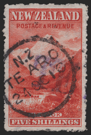 New Zealand 1902-07 5s deep red, perforations 14, watermark 43 upright, well-centred, neatly cancelled by central "TE ARO" circular date stamp of "24 OC 10" and part additional light violet "TE (?ARO)" namestamp.