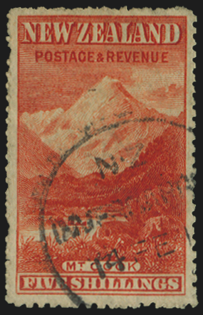 New Zealand 1902-09 5s deep red, watermark 43 sideways, perforations 14, SG329.