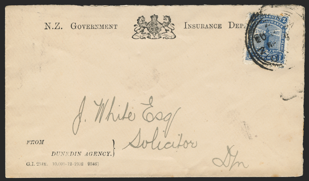 New Zealand Life Insurance 1903 (22 ?P) Official printed envelope (G.I. 284K. 10,000-12-1902 9346, 'FROM DUNEDIN AGENCY' printing, unrecorded by Brodie) to Dunedin. Franked by 1902-04 perforations 11 1d blue 'Lighthouse' paying the local letter rate, tied by Dunedin 3-ring circular date stamp.