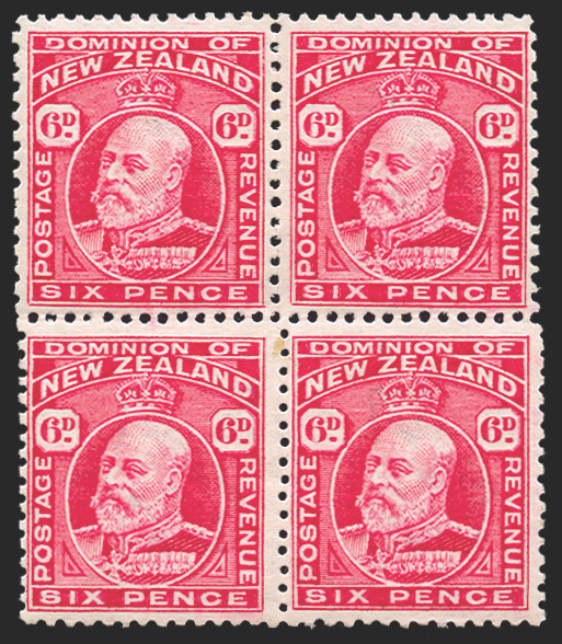 New Zealand 1909-16 6d carmine, two-perforation block of 4, SG403a.