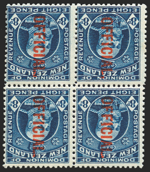 New Zealand 1910-16 8d indigo-blue Official, two perforation block of 4, variety watermark inverted, SGO76cw.