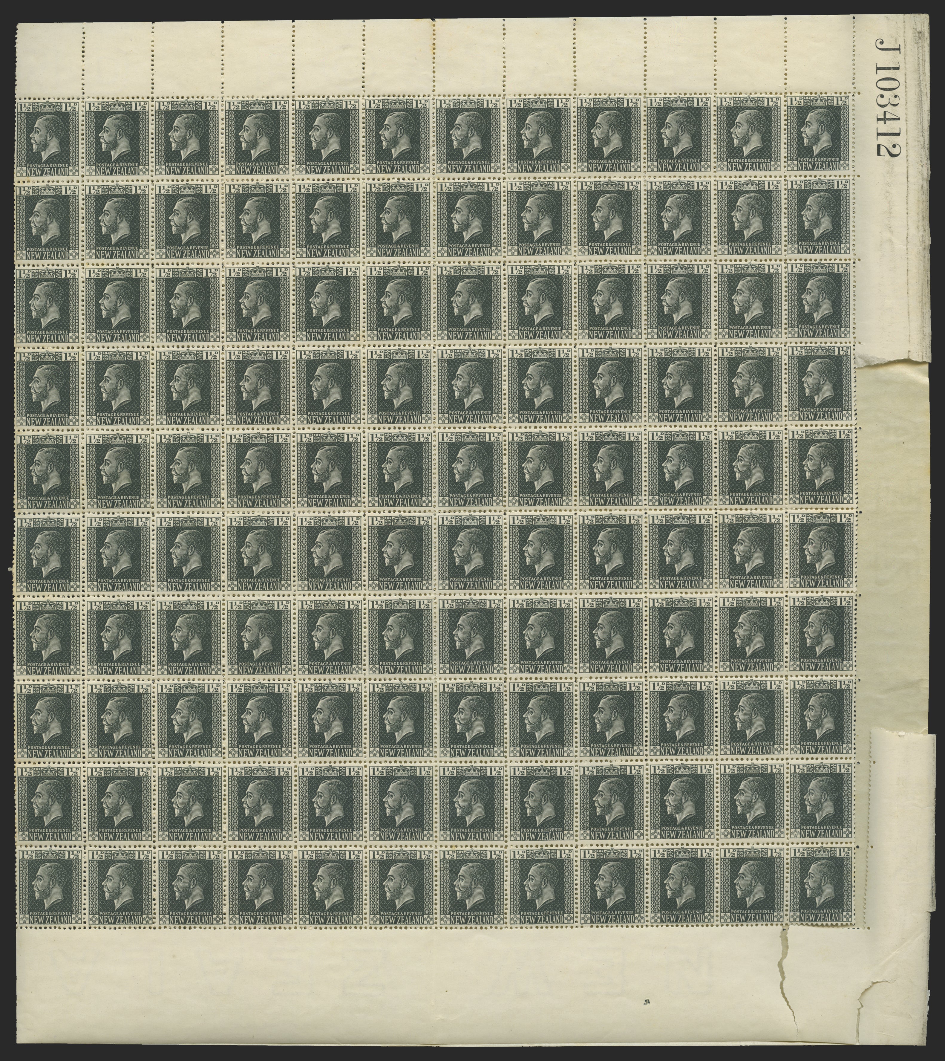 New Zealand 1915-33 1½d slate, watermark 43, complete folded sheet of 240 (24x10) with sheet number 'J103412', SG437.