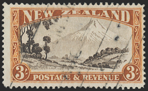 New Zealand 1935-36 3s chocolate and yellow-brown, SG569ay watermark 43, perforations 13½x14, variety watermark inverted and reversed from the experimental 'wet' printing.