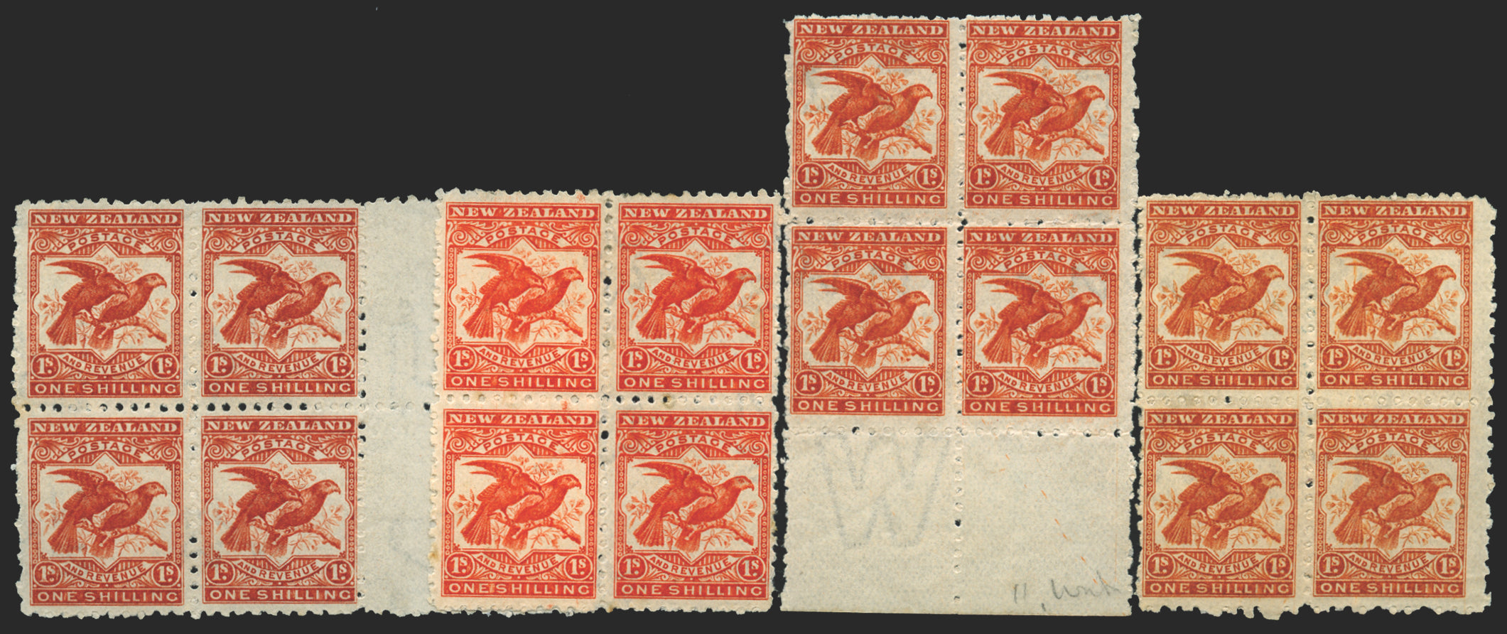 New Zealand 1902-07 1s "Kea and Kaka", watermark 43 sideways, perforations 11, four blocks of 4 in various shades, brown-red, red, orange-red and orange-brown, SG315/c.
