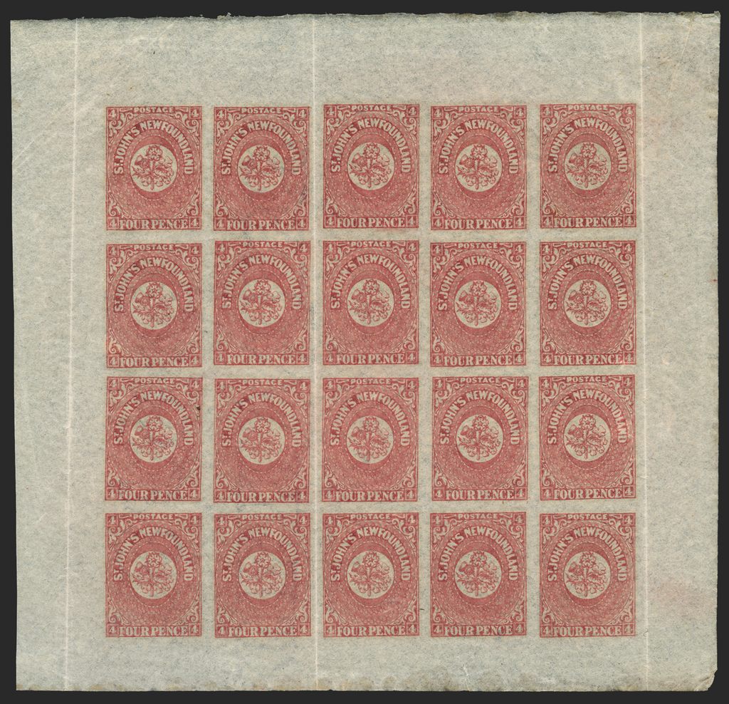Newfoundland 1862-64 4d rose-lake, complete sheet of 20 (5x4), with "(ST)ACEY WISE/1858" large part papermaker's watermark covering six stamps in the two left hand columns, SG18.