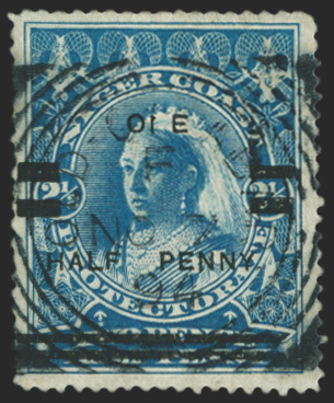 Niger Coast 1894 (10 Aug) ½1/2d on 2½1/2d blue, type 17 surcharge, Old Calabar provisional, showing variety 'OIE' for 'ONE', from position 8 of the row of 8, cancelled by large part 'OLD CALABAR RIVER' squared circle date stamp, dated 'NO 7 94', SG65b.