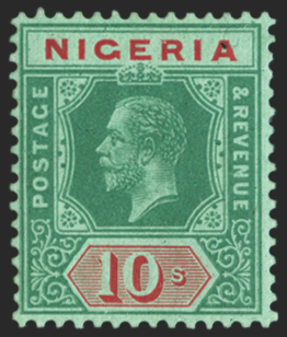 Nigeria 1914-29 10s green and red/blue-green (blue-green back), watermark MCA, SG11a.