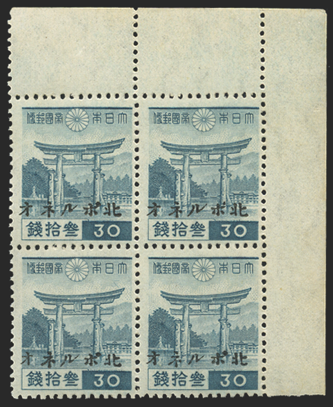 North Borneo Japanese Occupation 1944-45 30s turquoise-blue, type 8 overprint on Japan, upper right corner block of 4, SGJ46.