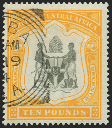 Nyasaland 1897-1900 £10 black and yellow, "Coat of Arms", SG52.