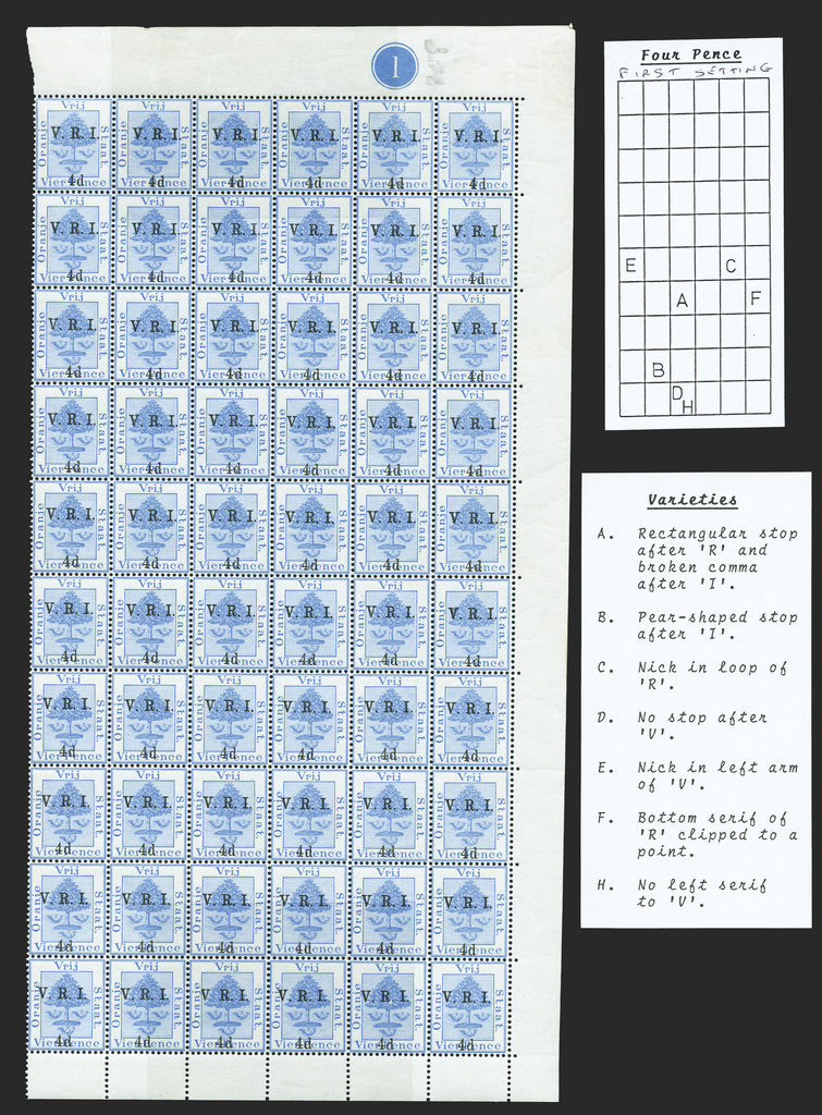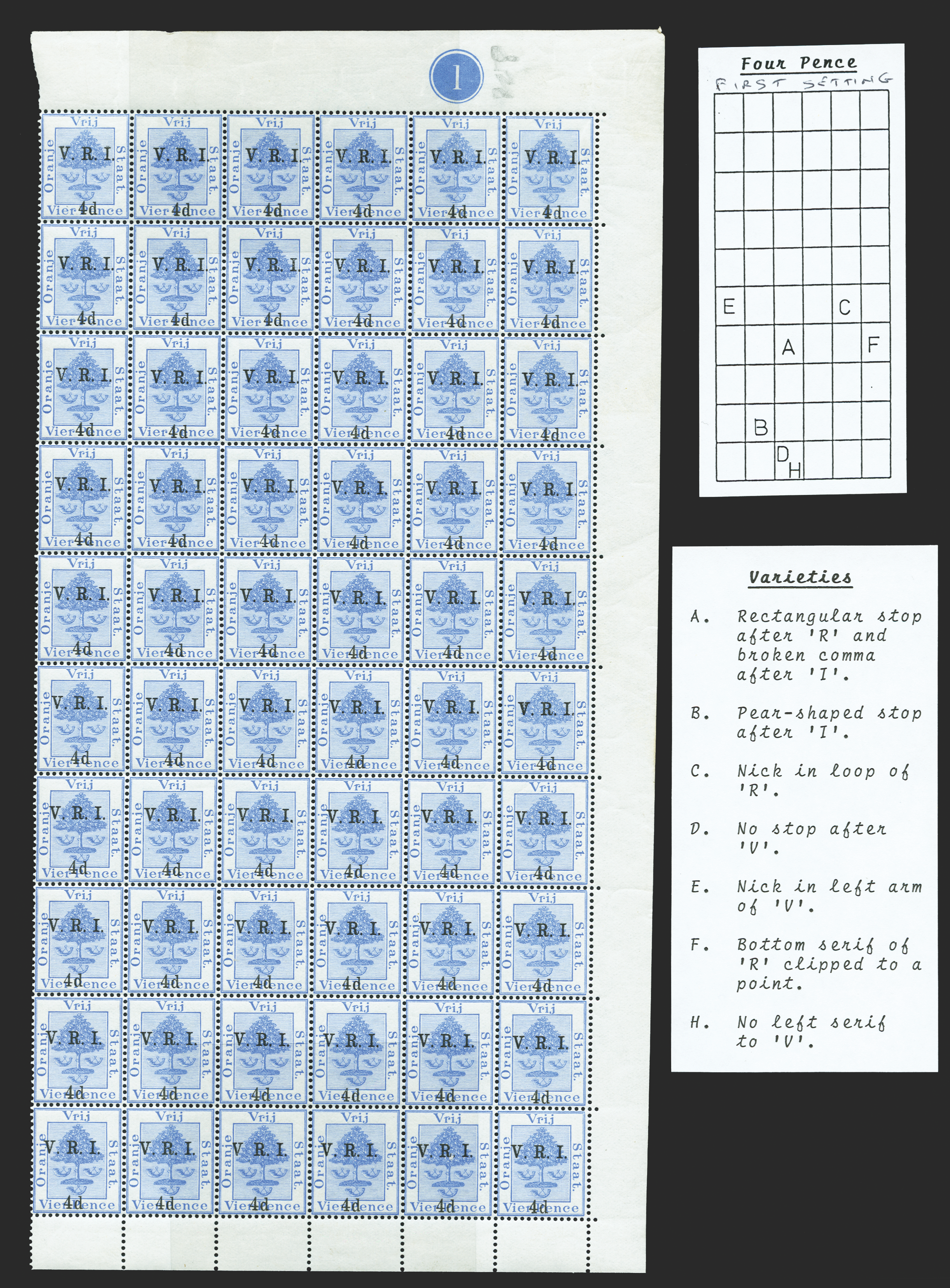 South Africa Orange Free State 1900 4d on 4d ultramarine, type 31 surcharge, with level stops, complete upper right pane of 60 (6x10) from first setting with plate number '1' and full margins except at left, showing variety 'No stop after V' at R10/3, with chart of diagnostic flaws, SG107a.
