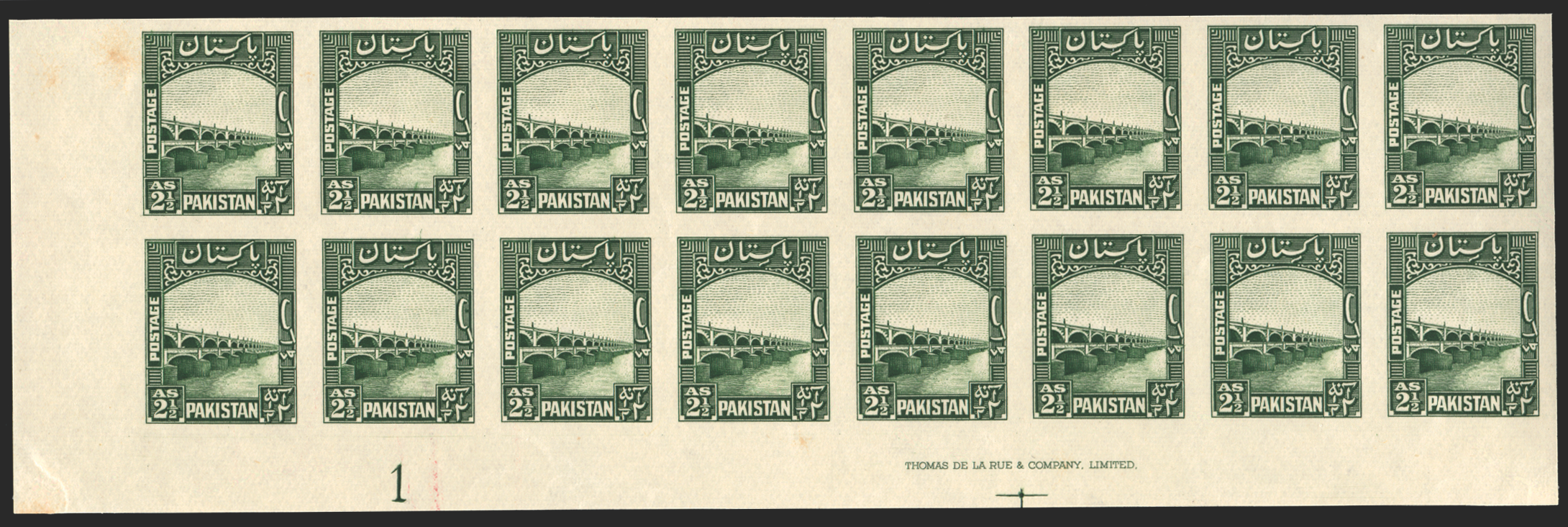 Pakistan 1948-56 2½a green 'Lloyds Barrage', IMPERFORATE lower left corner block of 16 (8x2) with plate number '1' and printers, De La Rue imprint, SG30.