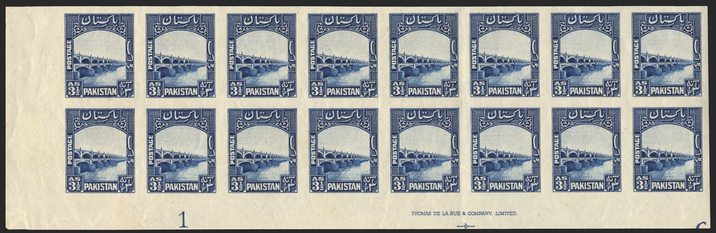 Pakistan 1948-56 3½a bright blue 'Lloyds Barrage', IMPERFORATE lower left corner block of 16 (8x2) with plate number '1' and printers, De La Rue imprint, SG32.