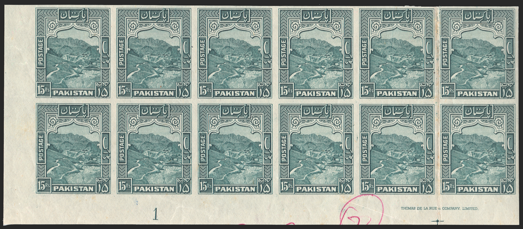 Pakistan 1948-56 15r blue-green 'Khyber Pass', IMPERFORATE lower left corner block of 12 (6x2) with plate number '1' and printers, De La Rue imprint, SG42.