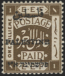 Palestine 1920 (6 Dec) 1m sepia, type 6 overprint (Arabic 10mm, narrow setting), perforations 14, SG45.