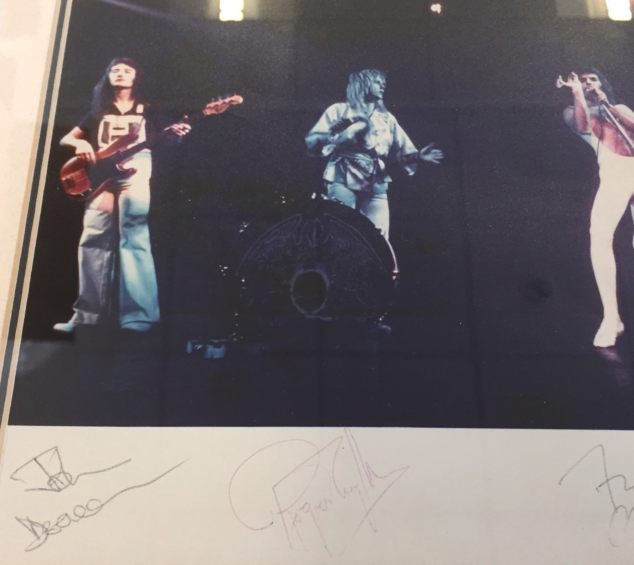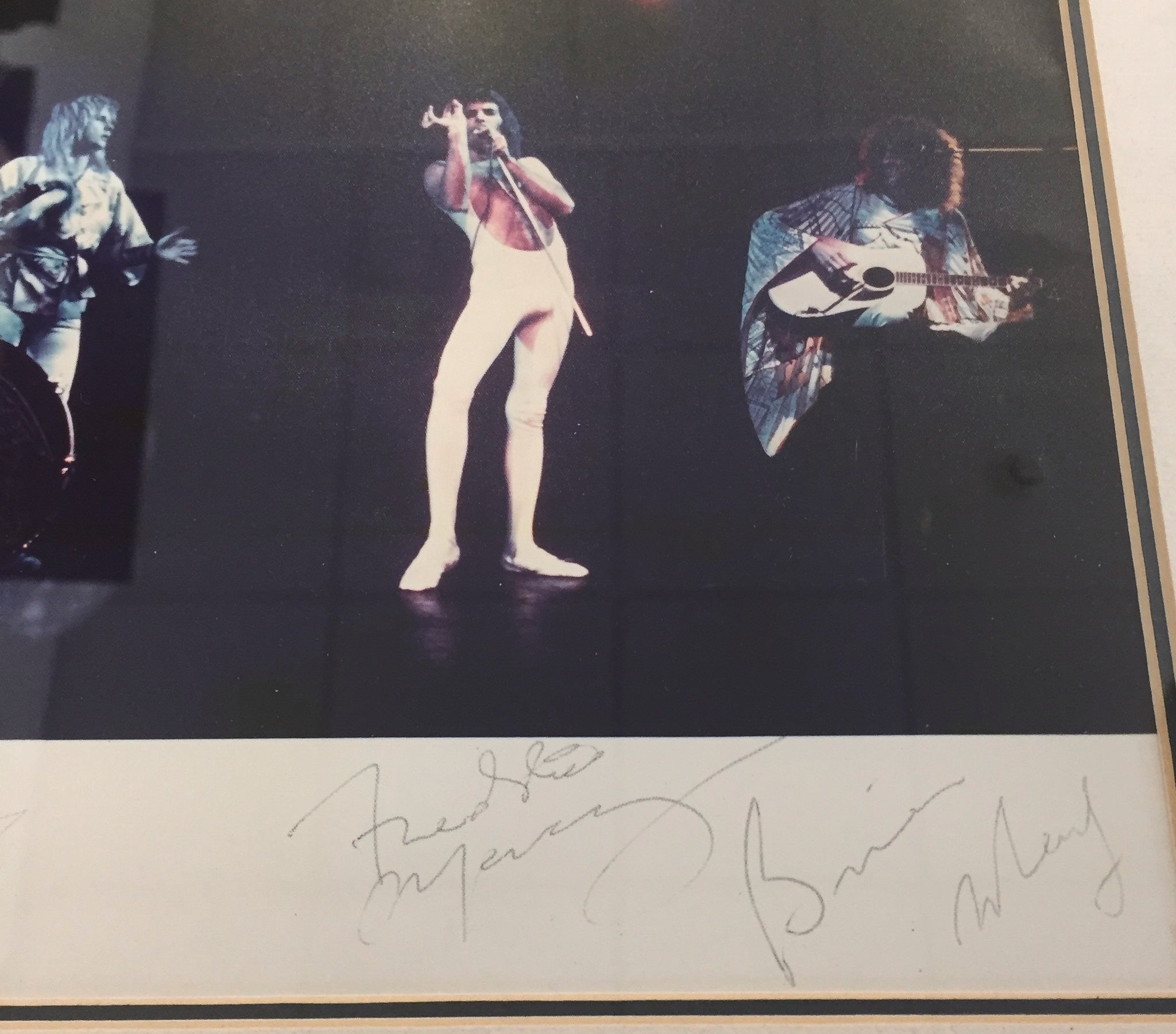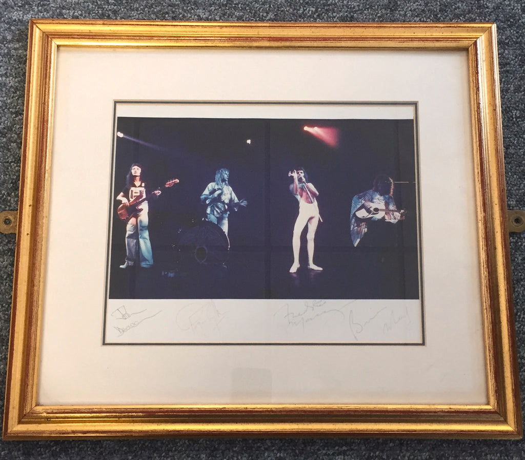 An 8 x 10 inch photograph of Queen in concert signed by all four members of the band (Freddie Mercury, Brian May, Roger Taylor and John Deacon). Housed in a 16 x 14 inch frame. Rare.