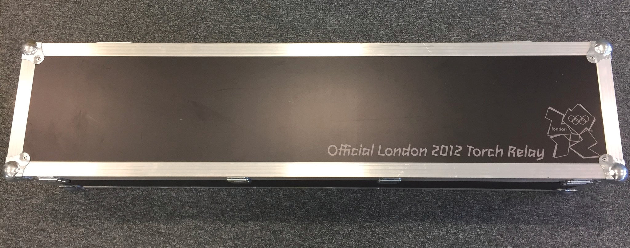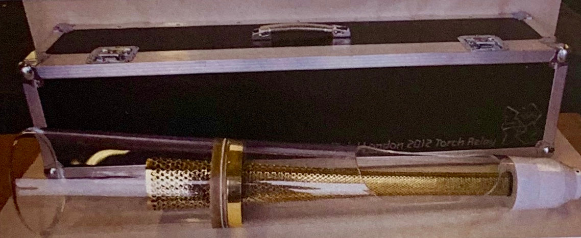 This London 2012 Olympic torch with glass encasement is one of two produced especially for the speedboat segment of the spectacular opening ceremony (one was a reserve).
