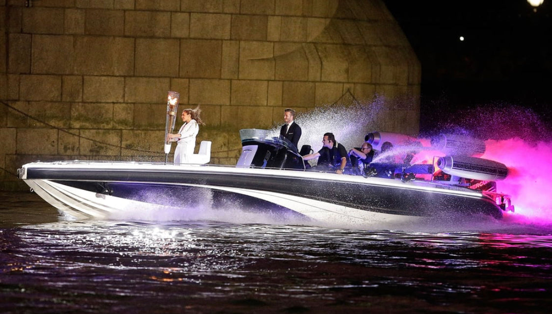 The glass encasement ensured the flame could withstand water spray and wind as the speedboat sped up the Thames. David Beckham accompanied the torch during this stage, handing it on to Steve Redgrave.