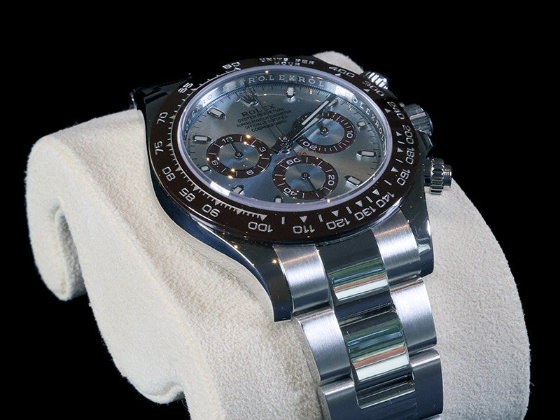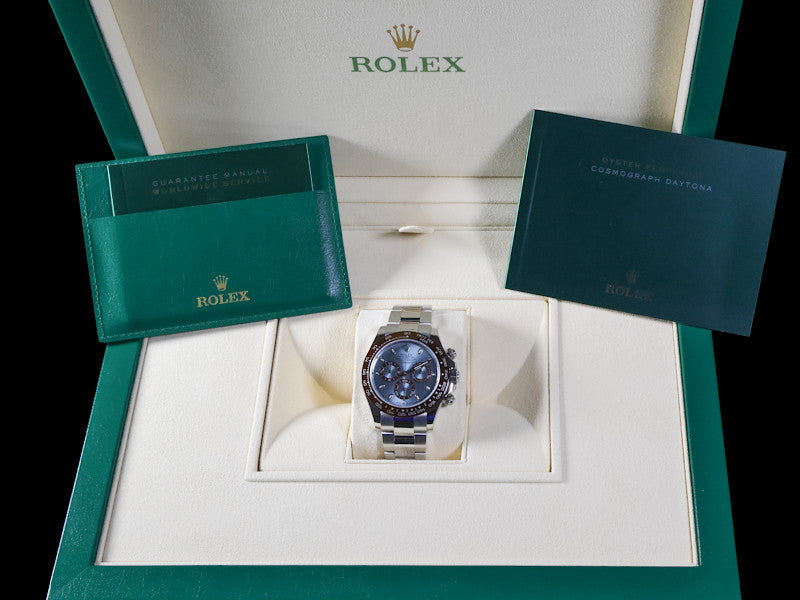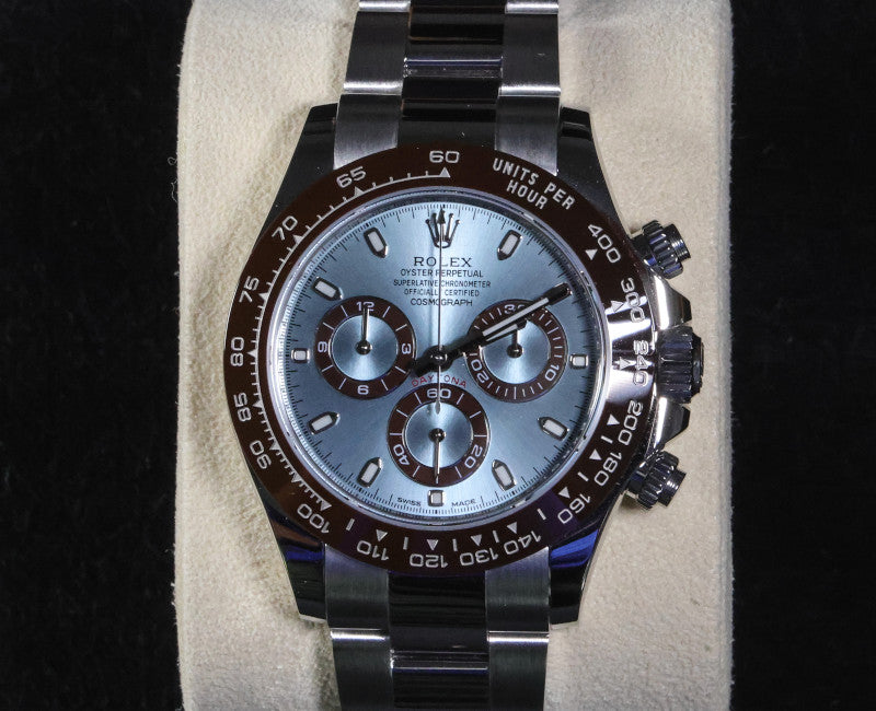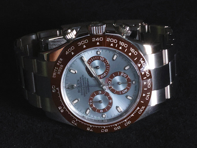 It was the first-ever Daytona produced with a platinum case and bracelet, and features the unique combination of a rich, chestnut brown ceramic bezel with the a glacier blue dial.