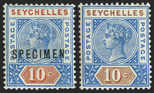 Seychelles 1890-92 10c ultramarine and chestnut, DIE I, overprinted 'SPECIMEN' (type D12), SG4var.