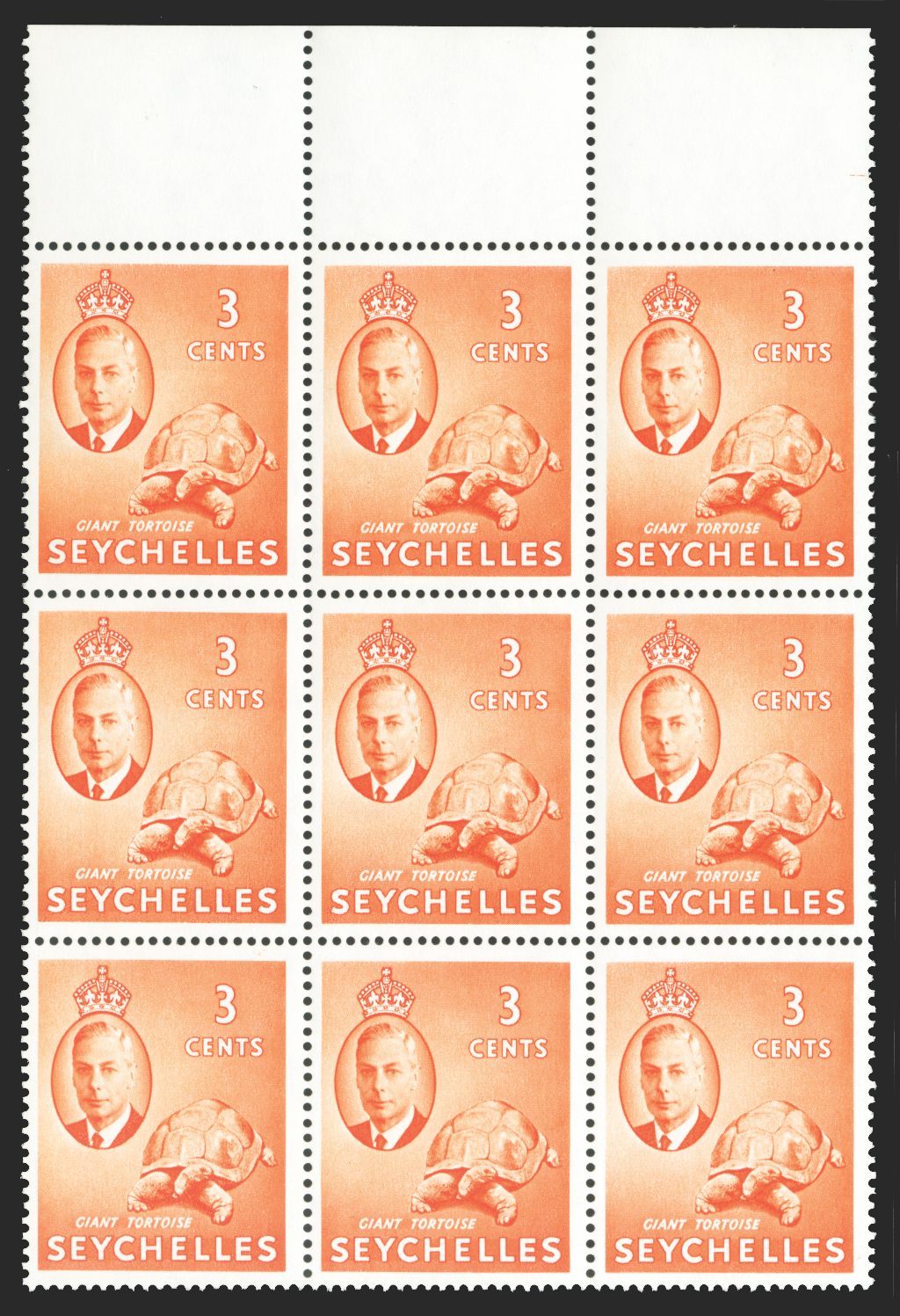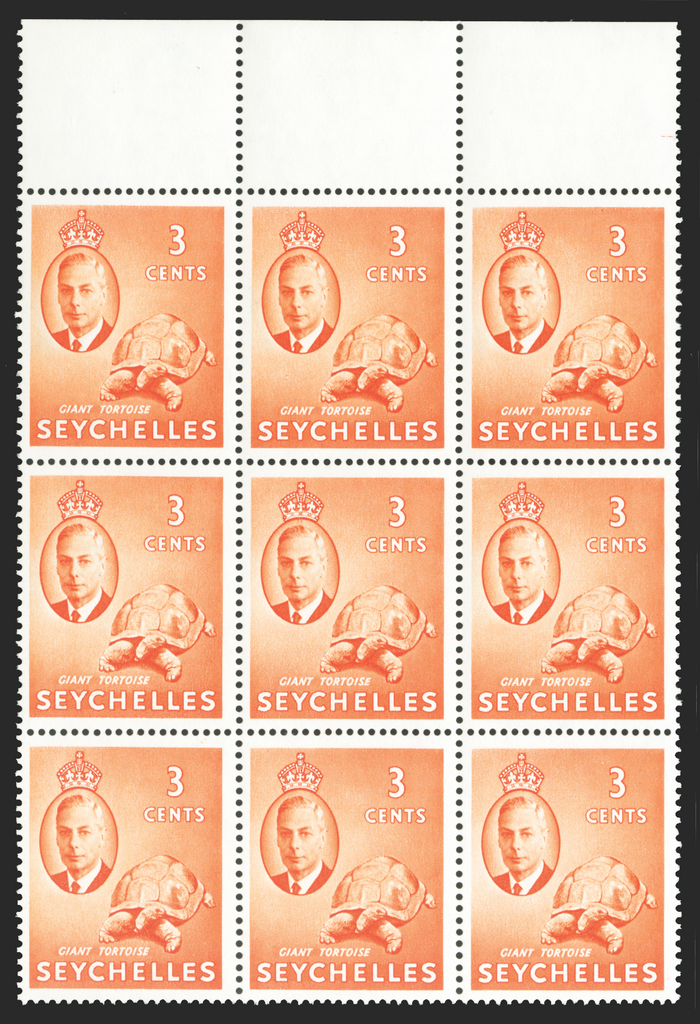 Seychelles 1952 3c orange, "Giant Tortoise", upper marginal block of 9, the centre stamp showing watermark error 'Crown missing' (W9a), SG159a.