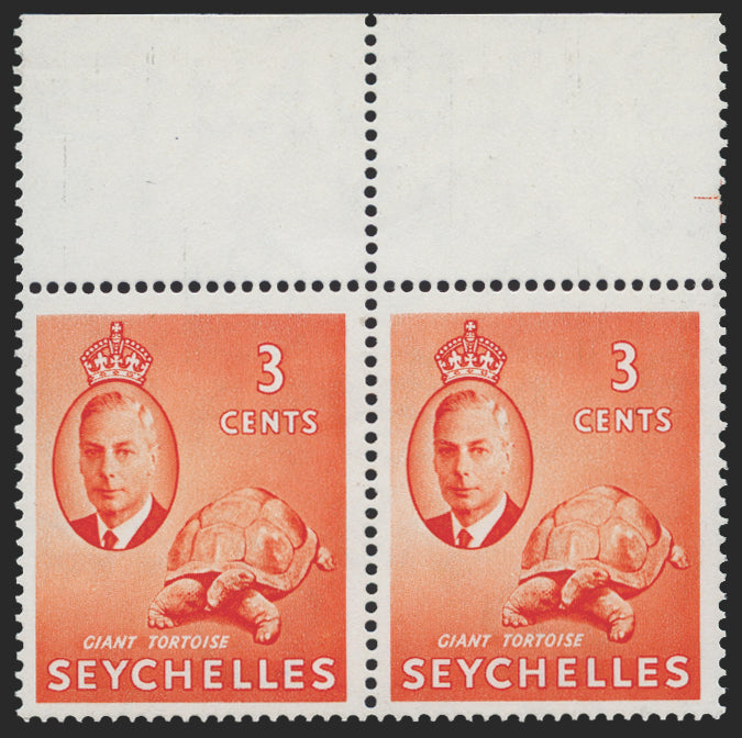 Seychelles 1952 3c orange 'Giant Tortoise', upper marginal horizontal pair with part centre guide, showing watermark error 'St. Edward's crown' on left stamp (R1/4), SG159/b.