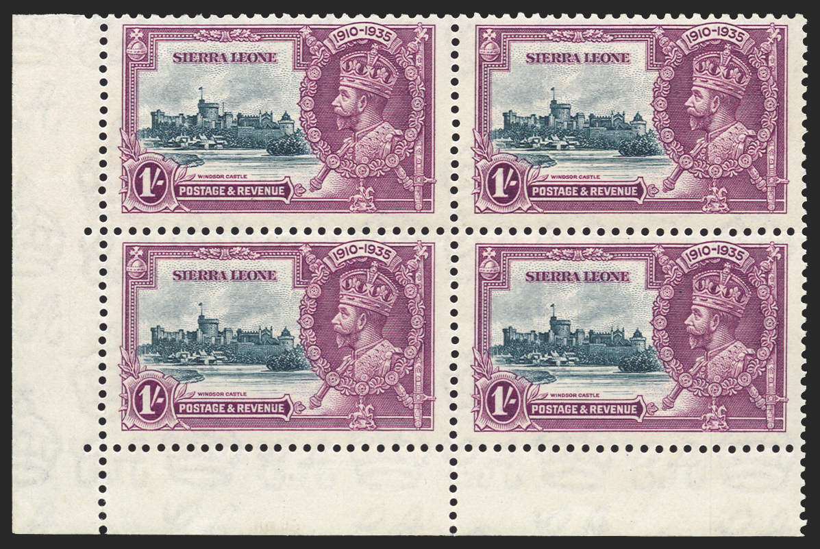 Sierra Leone 1935 Silver Jubilee 1s slate and purple, lower left corner block of 4 from vignette plate '1', showing variety 'Extra flagstaff' on R9/1, SG184a.