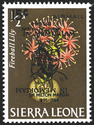 Stamp issue related to the Commemoration of Sir Milton Margai (1895-1964) and Sir Winston Churchill (1874-1965) "in memoriam two great leaders". Sir Milton Margai was prime minister of Sierra Leone from 1954 until his death in 1964.