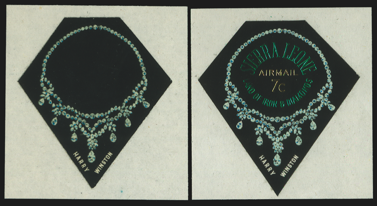 Sierra Leone 1965 self-adhesive 7c necklace, "LAND OF IRON AND DIAMONDS" error of missing colours 'Bright green and gold omitted, SG385a.