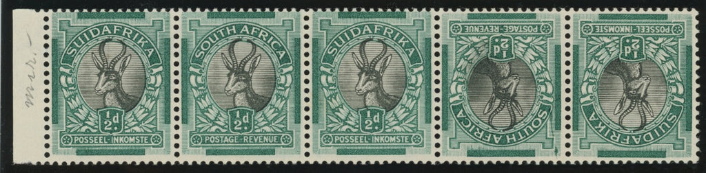 'SUIDAFRIKA' one word, left marginal horizontal strip of 5, with stamps four and five inverted resulting in a tete-beche pair (positions 3-4).