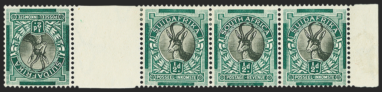 South Africa 1930-45 ½d black and green 'SUIDAFRIKA', rotogravure printing, inter-pane horizontal strip of 4 from right of sheet, including a tete-beche pair at left separated by vertical gutter, SG42b.