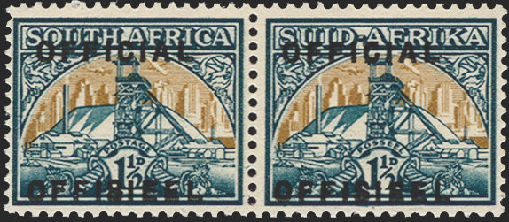South Africa 1944-50 1½d blue-green and yellow-buff "Gold Mine" Official, HORIZONTAL type O2 overprint (11-12mm space, as used for ½d value in vertical format), horizontal pair, SGO34var.