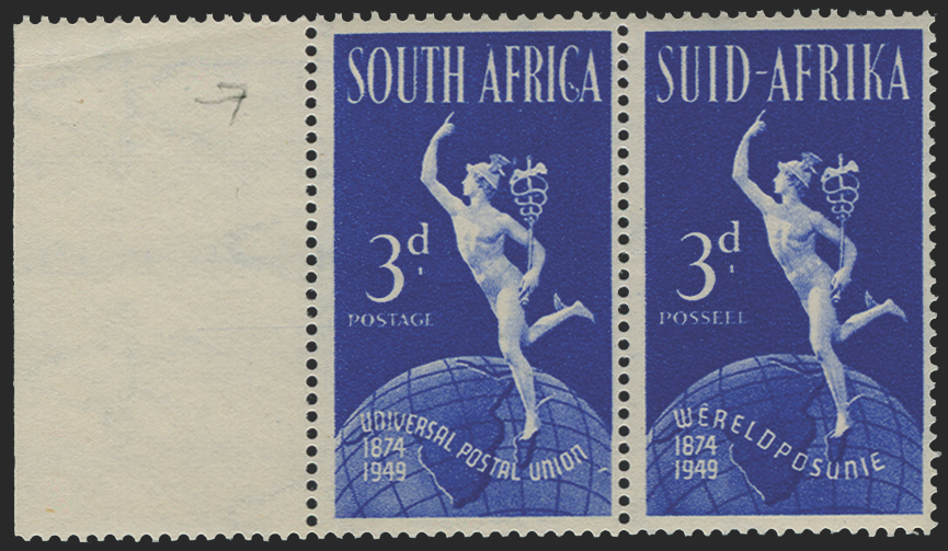 South Africa 1949 75th Anniversary of the Universal Postal Union 3d bright blue, left marginal horizontal pair, left stamp (R1/1) showing variety 'Serif on C', SG130a.