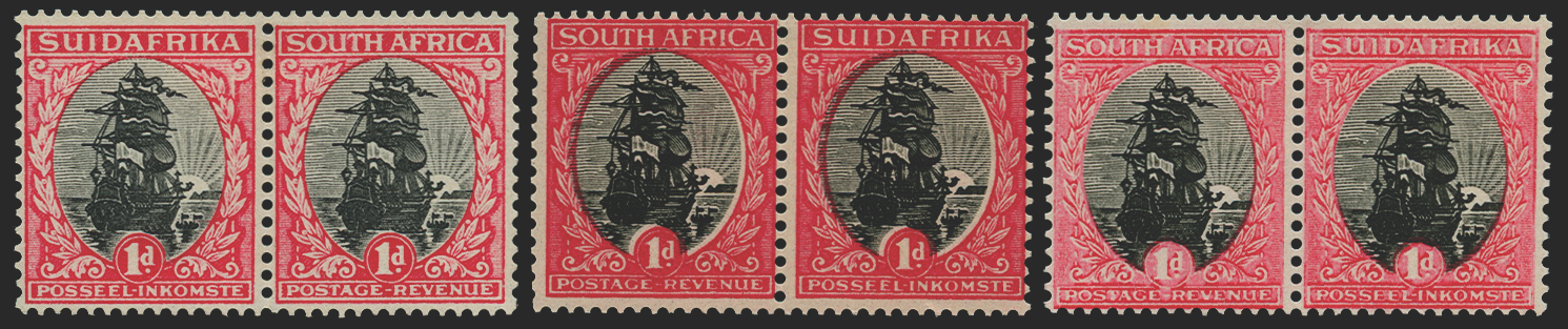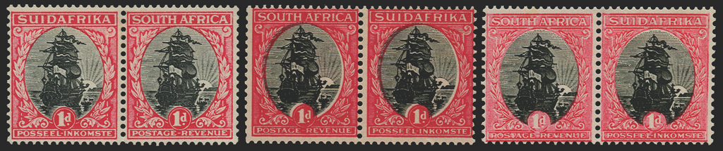 South Africa 1929 (c.) 1d "Ship" black and carmine, "SUIDAFRIKA" one word, perforated "Darmstadt" trial printing of complete design on unwatermarked gummed paper, THREE horizontal pairs in varying shades from different printings, SG43var.