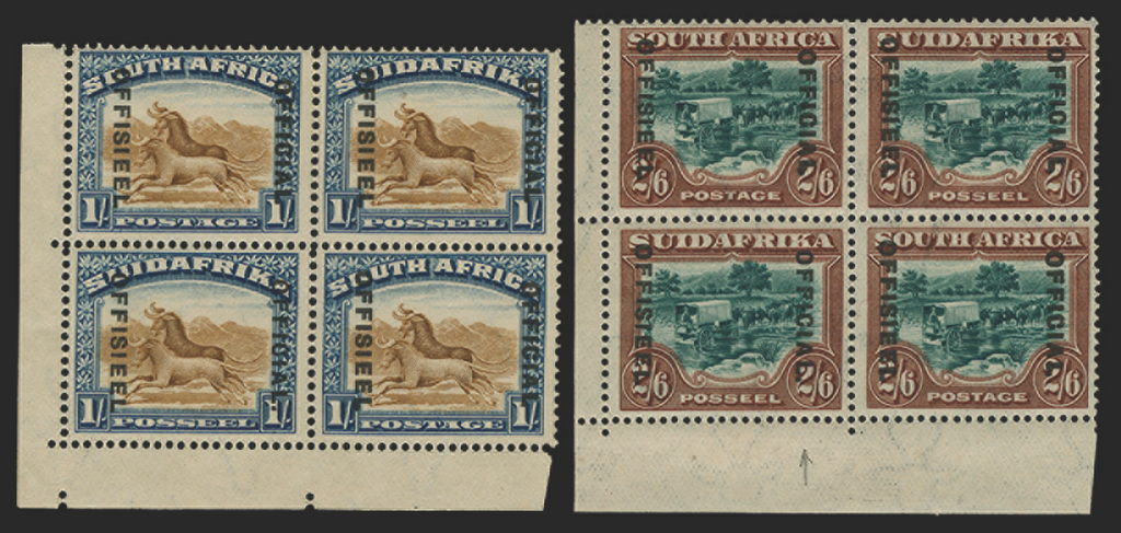 South Africa 1929-31 1s brown and deep blue and 2s6d green and brown Officials, recess printing, matching lower left corner blocks of 4, each with R10/1 showing printing variety stop after "OFFICIAL", SGO10a, O11a.