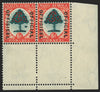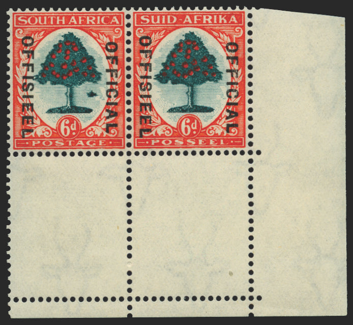 South Africa 1935-49 6d green and vermilion "Orange Tree" Official (die I), "SUID-AFRIKA" hyphenated, lower right corner horizontal pair, left stamp (R20/11) showing "Molehill" flaw, SGO24b.