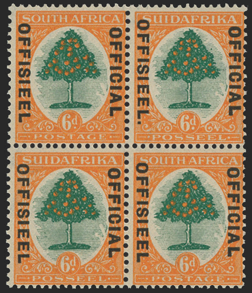 A scarce multiple including the printing variety of the famous "Orange Tree" government official South African stamp issue, particularly in such pristine condition.