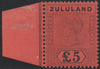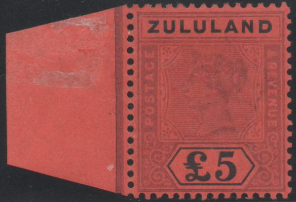 Zululand 1894 £5 purple and black/red, SG29. A Superb Mint Left-Hand Marginal Example. Rare and one of the finest known examples. This is the only marginal example we have ever handled. SG catalogue price is £5,500. Accompanied by a certificate of authenticity from the British Philatelic Association (BPA).