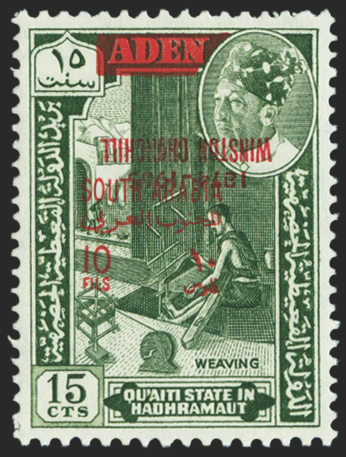 SOUTH ARABIAN FEDERATION 1966 Qu'aiti 10f on 15c bronze-green error, SG66a