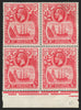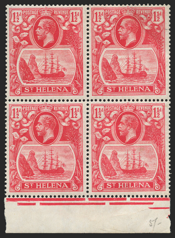 St Helena 1922-37 1½d rose-red, lower marginal block of 4 with part centre guide, showing variety 'Torn flag' on upper right stamp (R4/6), SG99/b.