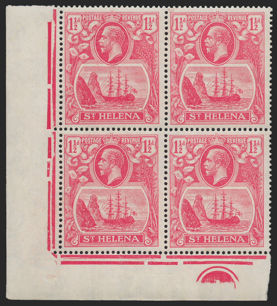 St Helena 1922-37 1½d rose-red, lower left corner block of 4 with plate number '1', showing variety 'Cleft rock' on R5/1 from 22/12/22 printing, SG99/c.