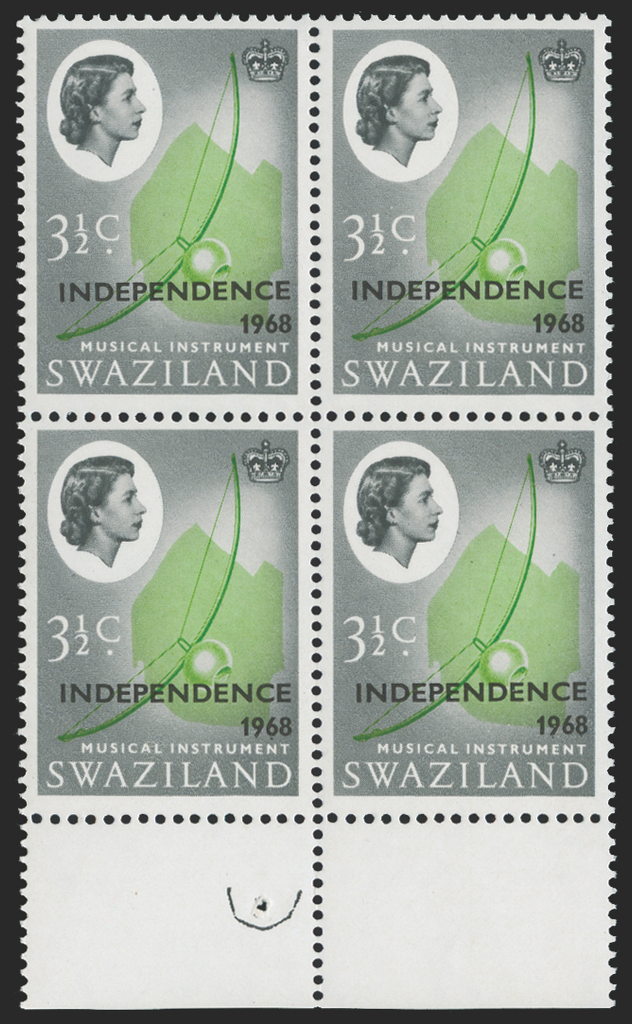 Swaziland 1968 Independence 3½c yellow-green and deep grey, type 42 overprint, variety WATERMARK INVERTED, lower marginal block of 4 from a right pane with sheet marking proving R4-5/5-6, SG147w.