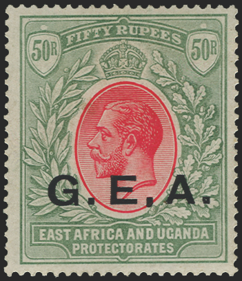 After the Allied invasion of German East Africa in World War I, civilian mail was accepted by the Indian Army postal service using Indian stamps overprinted 'I.E.F.' Some offices, however, reverted to civilian control on 1 June 1917. They used these stamps from East Africa and Uganda, which then included the "G.E.A." overprints once they were ready.