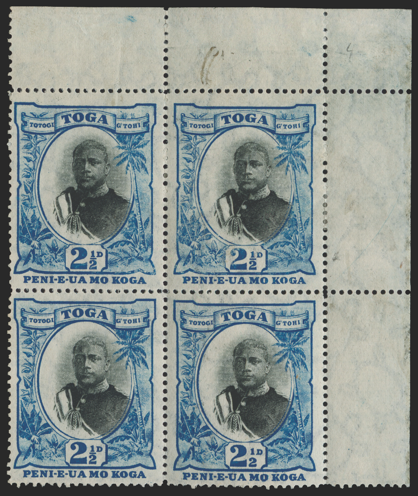 Tonga 1897 2½d black and blue, watermark sideways, upper right corner block of 4, R2/10 showing variety 'No fraction bar in '½', SG43b/ba.