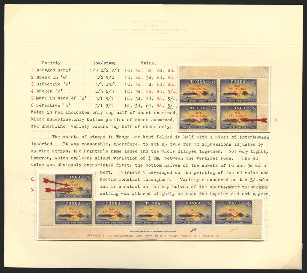 Also includes four covers, with sets on First Day Covers from Nukualofa and Haapai. A fascinating collection with many constant flaws highlighted and an original "TONGAN GOVERNMENT GAZETTE" announcing the issue.