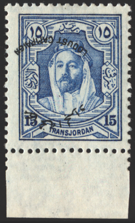 Transjordan 1930 'Locust Campaign' 15m ultramarine, error OVERPRINT INVERTED, lower marginal example, SG188a.