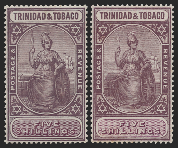 An interesting pair of the "Sitting Britannia" design, which was used for the 1913-1923 first Trinidad & Tobago issues. This represented a continuation of the motif from the earlier produced Trinidad stamps.